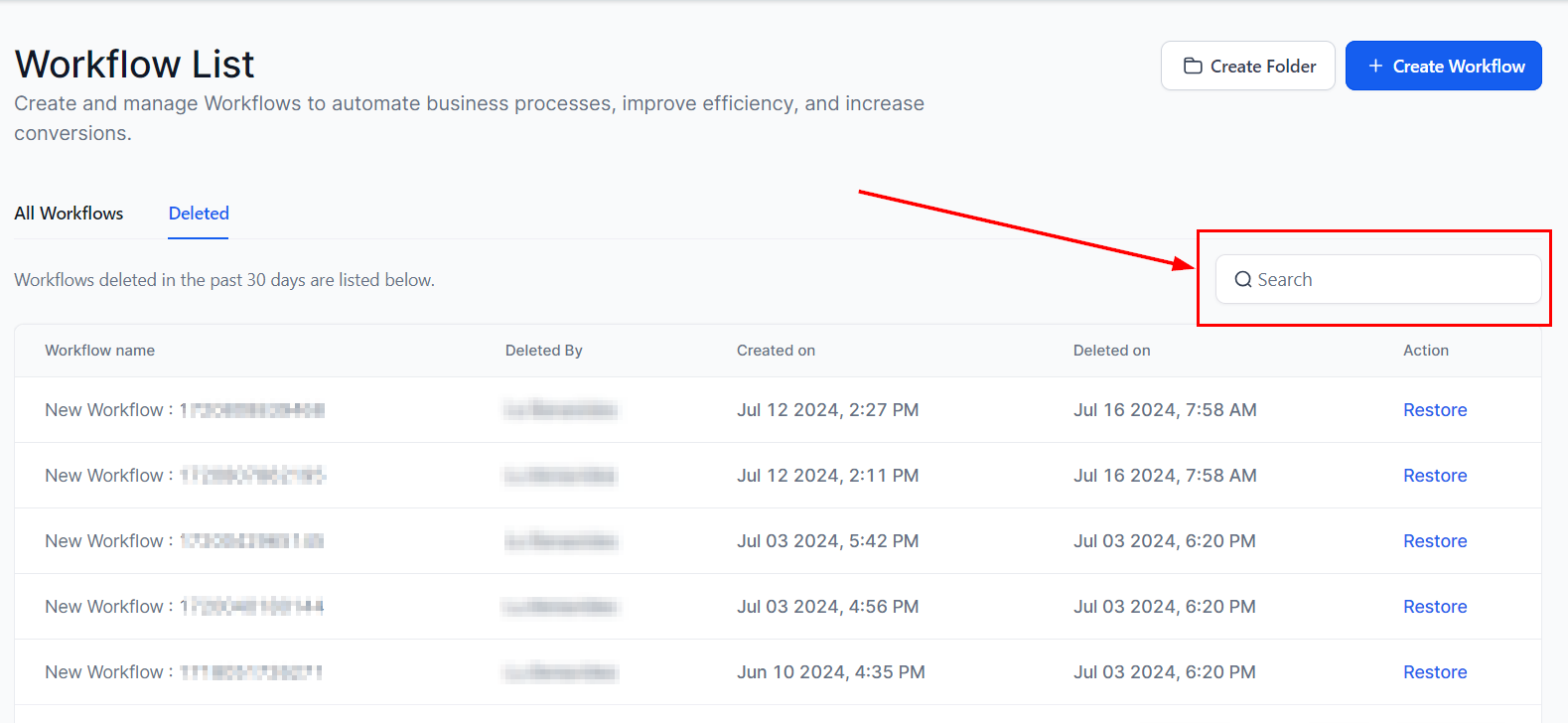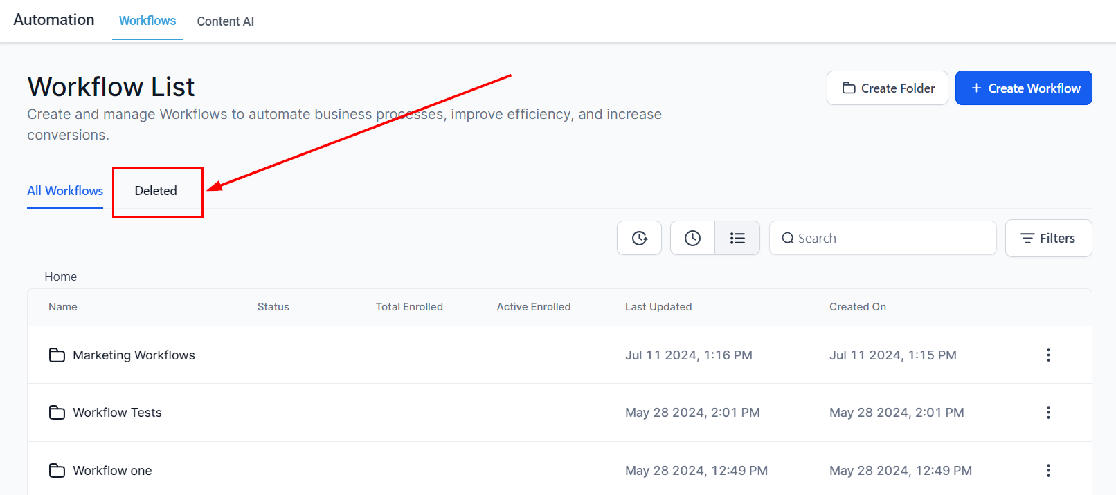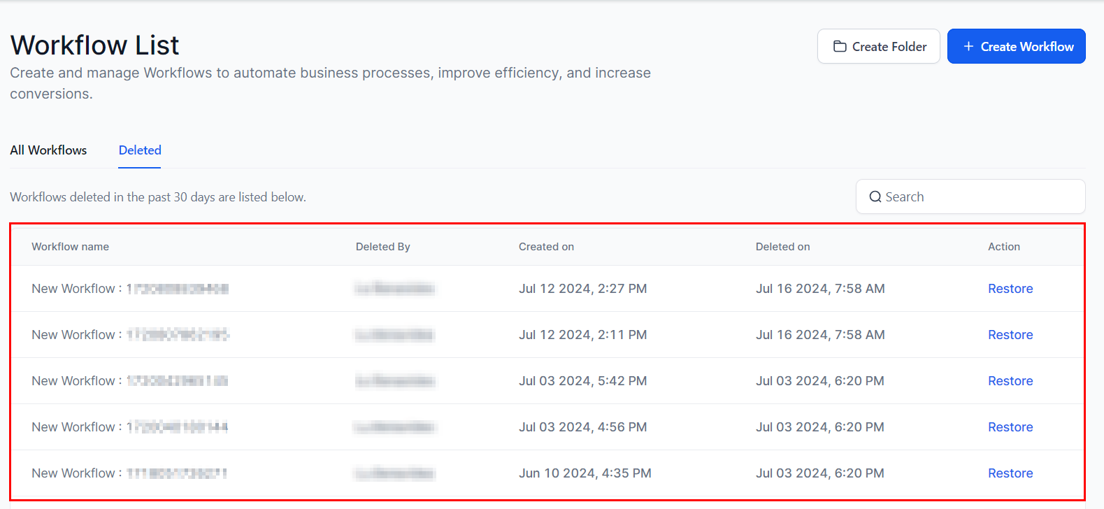 2. Access the Deleted Tab by selecting the โDeletedโ button. Workflows deleted in the last 30 days will be listed in this tab.