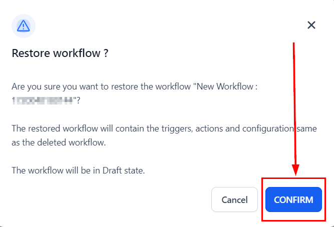 4. Once you have identified the workflow, click the "Restore" button corresponding with the workflow, then confirm the action.