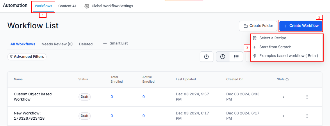 To get started, navigate to the Automation tab from the left navigation menu, then go to Workflows and click on '+ Create Workflow'. You can start from scratch, Select a recipe, or use an Examples based workflow to begin setting up your workflow.
