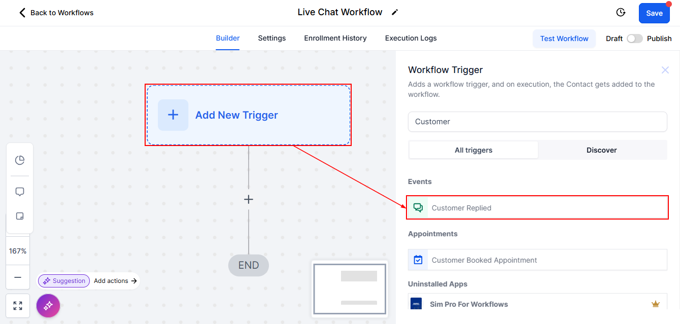 Imagine a customer inquires about product availability via live chat. With the live chat trigger and action set up, your CRM can automatically respond with stock information or direct the customer to relevant resources, enhancing their shopping experience without manual intervention.