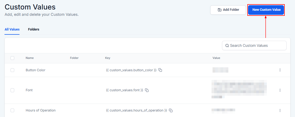 To set up custom values go to your CRM Settings and select βCustom Values.β Define the data you want to automate, such as appointment pages, product links, or survey URLs. Save these values, making them available for use in automation workflows.
