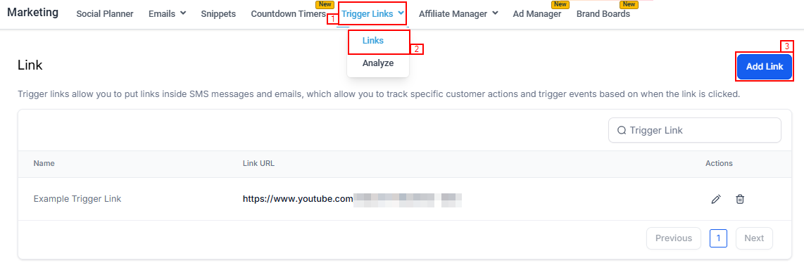 Navigate to the "Marketing" section in your CRM, on the "Trigger Links" dropdown select Links, and click on Add link to create a new trigger link. Assign a name that reflects its purpose, such as βOrder Form Follow-Up.β Insert the URL using a custom value, ensuring it dynamically updates for each lead or campaign.