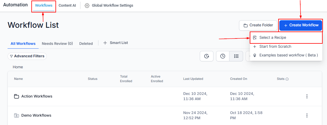 To start, navigate to Automation > Workflows > +Create workflow > Select a Recipe.