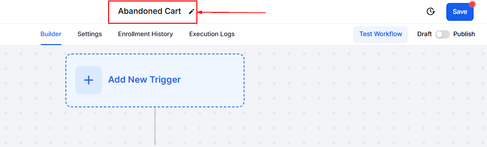 To get started, create a new workflow and name it appropriately, such as "Abandoned Cart."