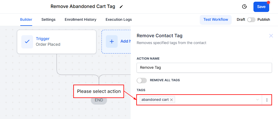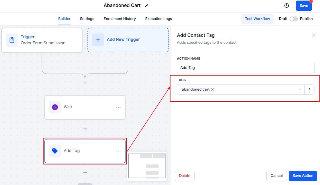Add a contact tag step and select or create a tag, such as "Abandoned Cart," to label contacts who have abandoned their carts.