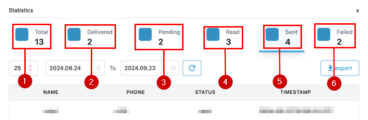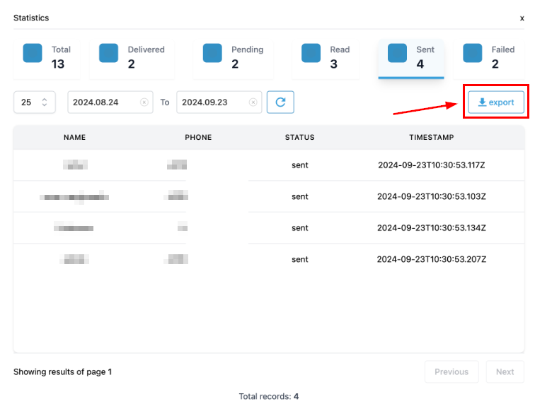 Additionally, you can download a detailed statistics report by clicking the Export button at the top right corner.