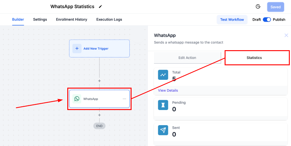 Total: These will show the number of WhatsApp messages triggered by the selected workflow action.