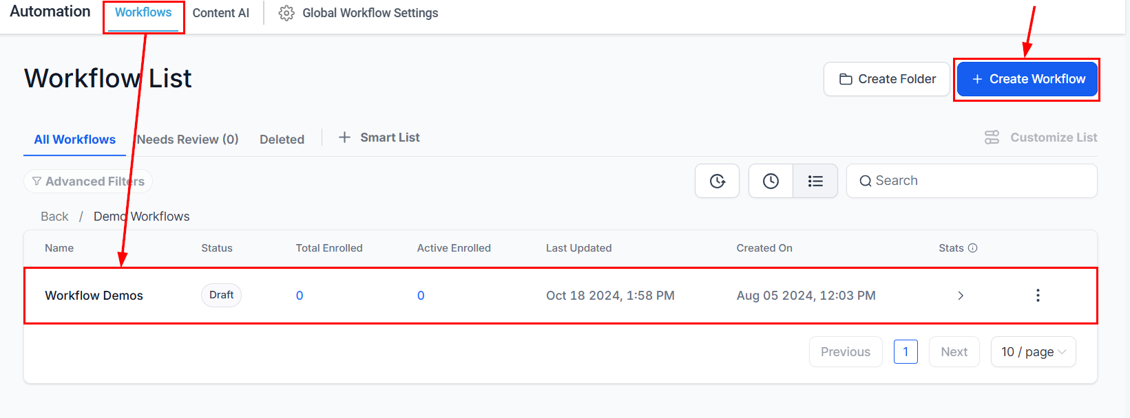 Go to the Automation > Workflows section in your account, then select an existing workflow from the list or create a new one from scratch.