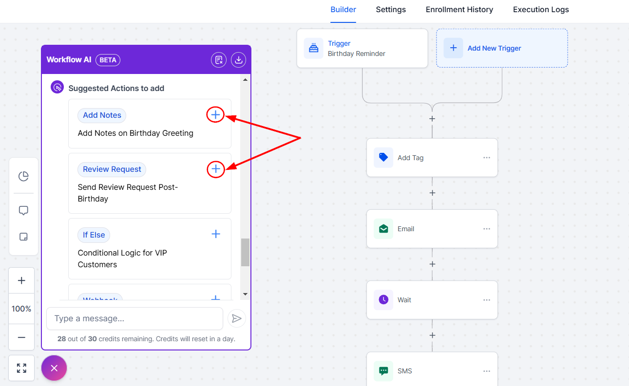Workflow AI can provide detailed action steps, and explanations of actions, and list specific triggers to help you achieve your workflow goals. For each action, click the "+" icon to add it to your workflow, and Workflow AI will guide you through the configuration.