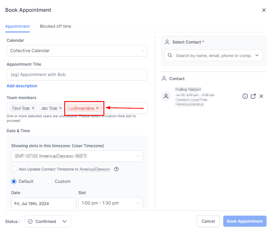 If you select someone unavailable for the appointment the system will notify you and highlight their name in red. You can then switch the user or add a custom time slot.