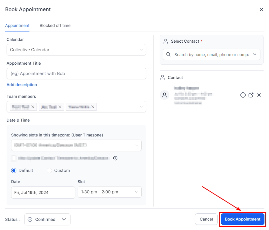 Select the desired Collective Booking calendar and contact for the appointment.