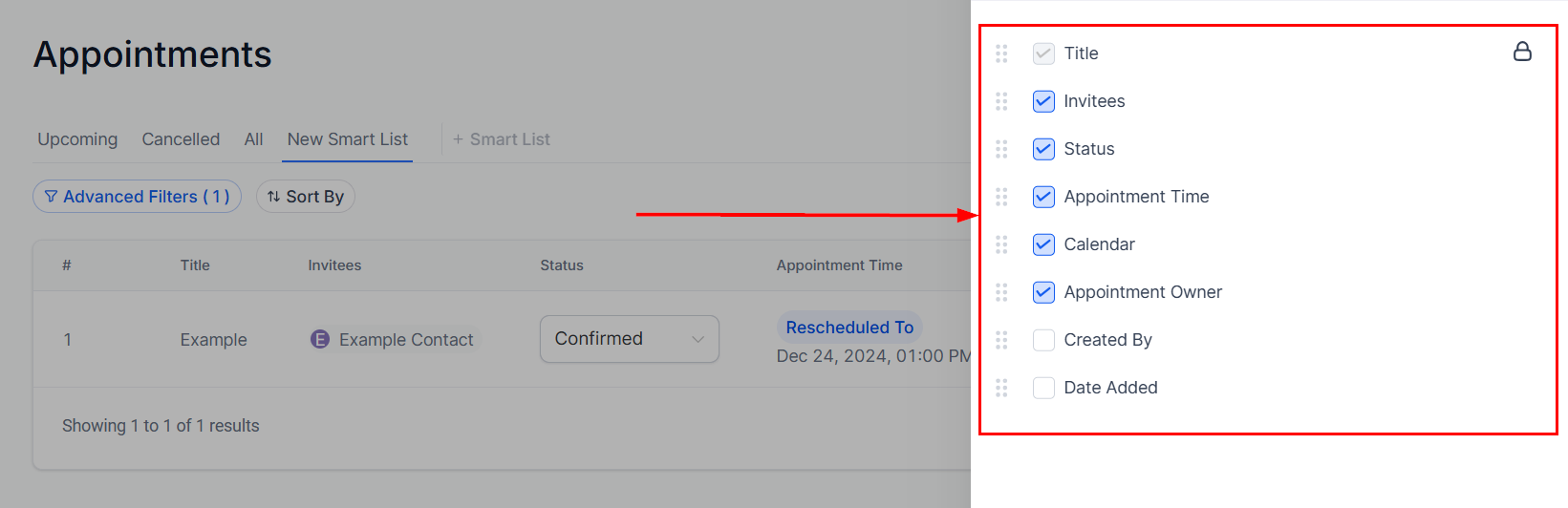 Customize the columns displayed in your appointment list and rearrange them according to your preferences within the Columns section.