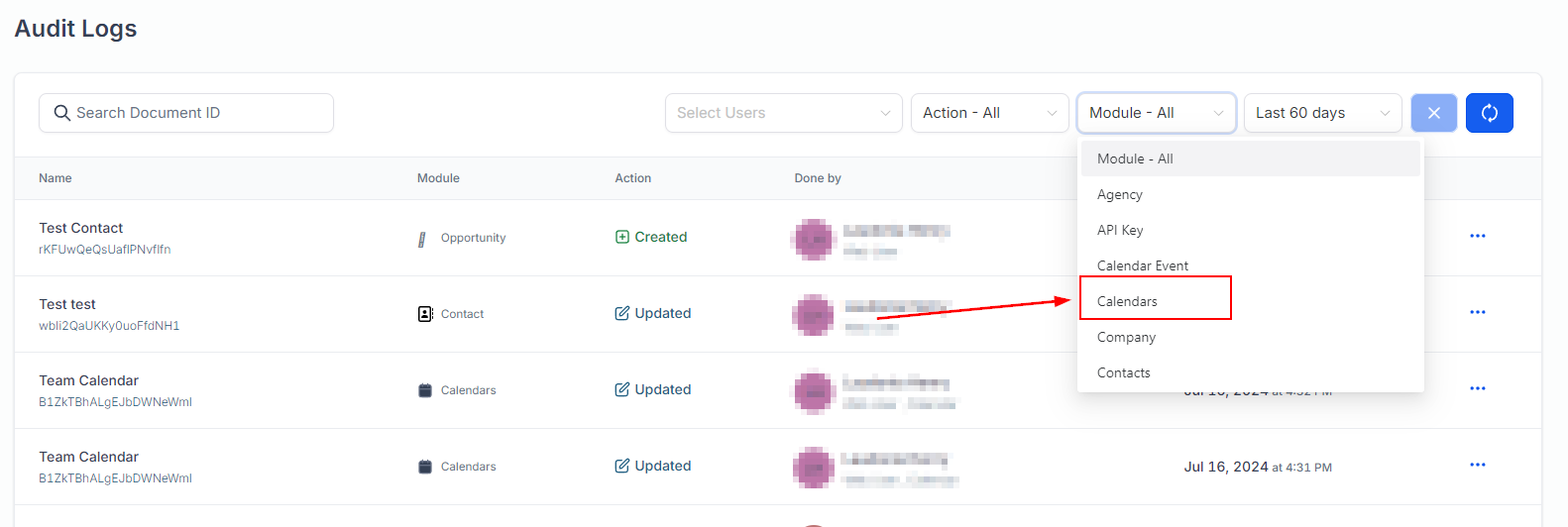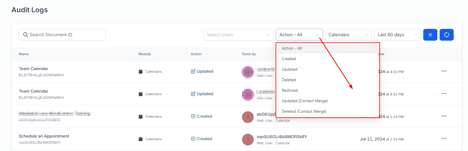 Audit Logs provide a record of all activities within the system, they are instrumental in tracking the source of changes, ensuring data integrity, and making troubleshooting easy. For the Calendars, they also help you view extra information about the appointments or changes to them. This helps keep accountability across team members and saves any missing appointments and their information.