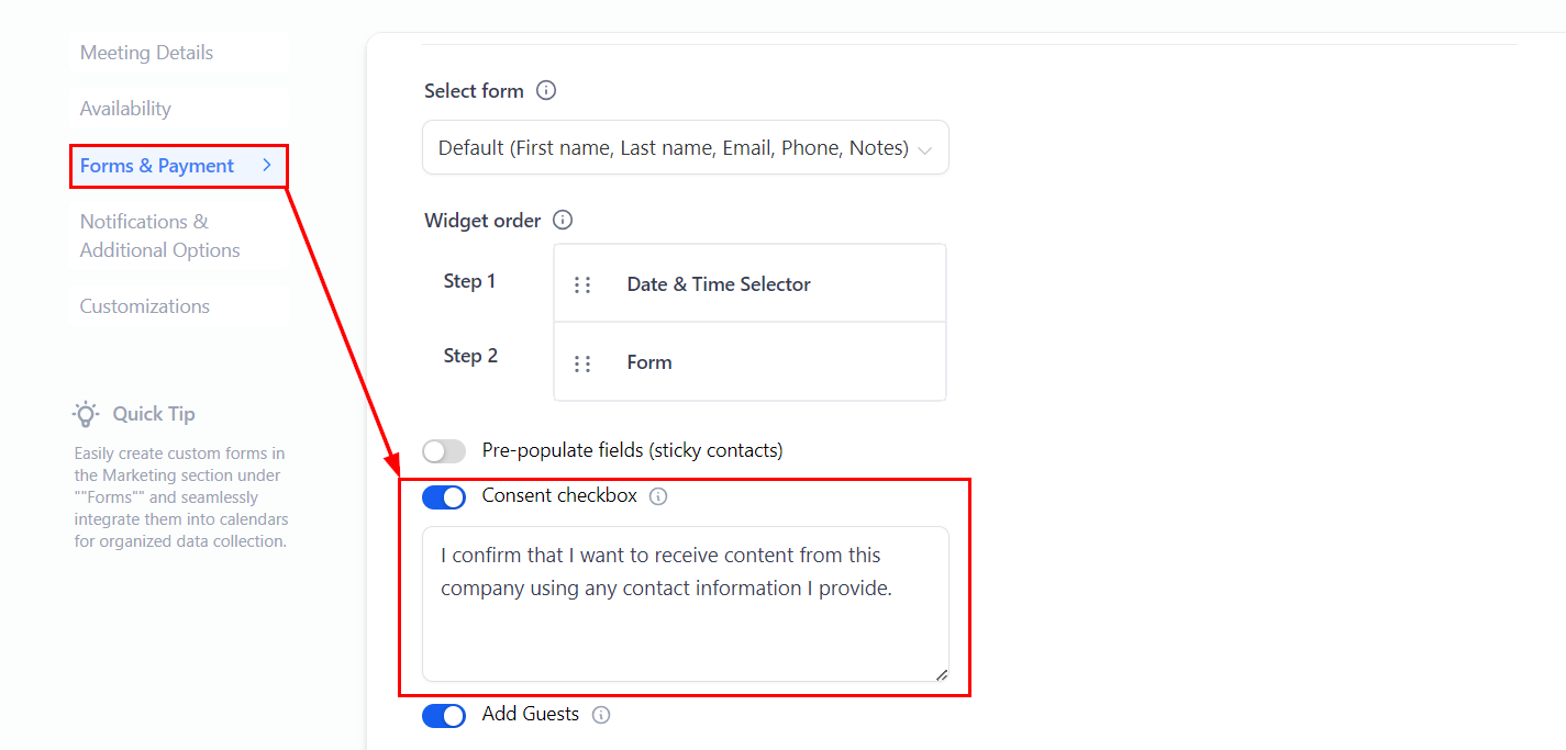 Navigate to the "Forms and Payments" area and locate the "Consent Checkbox" option. By default, this option is enabled for new calendars, but you can toggle it on or off as needed. If you wish to use a custom message, you can modify the default consent message to better suit your requirements.