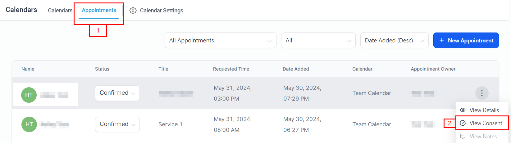 Return to the "Calendars" section and view the appointments list. Locate the appointment of interest and check for a consent verification option.
