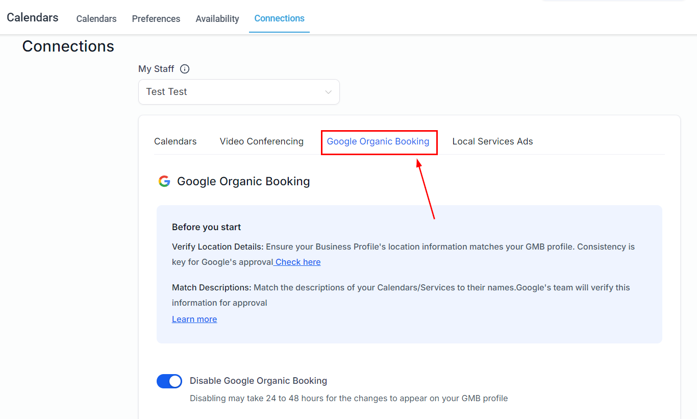 Here you can manage your connection preferences for Google Organic Booking service listing.