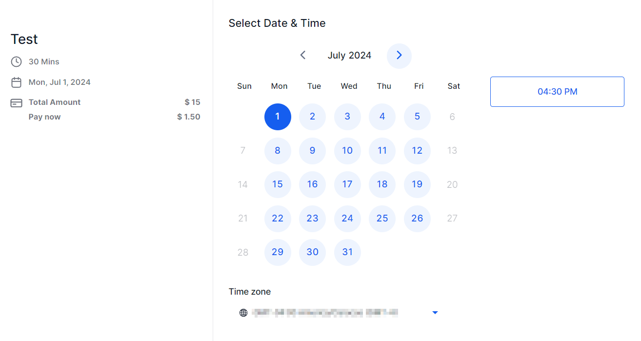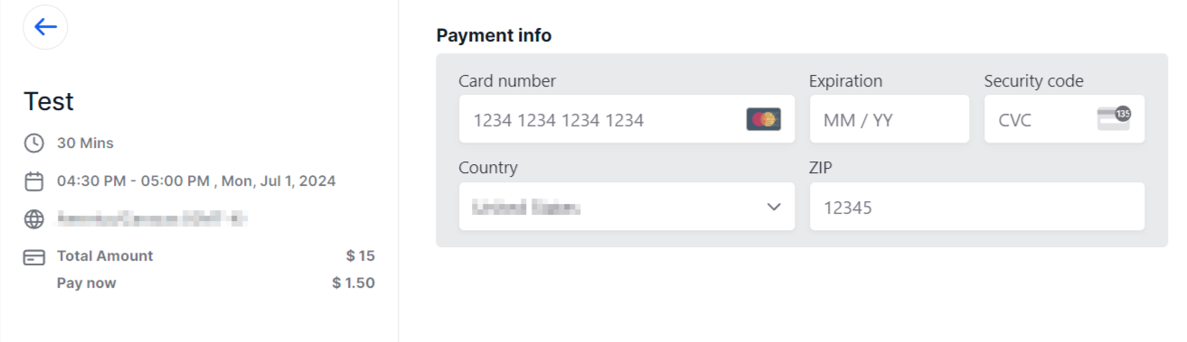 After filling out the information and scheduling a meeting you can see the payments integration that will appear when someone books an appointment on your calendar.