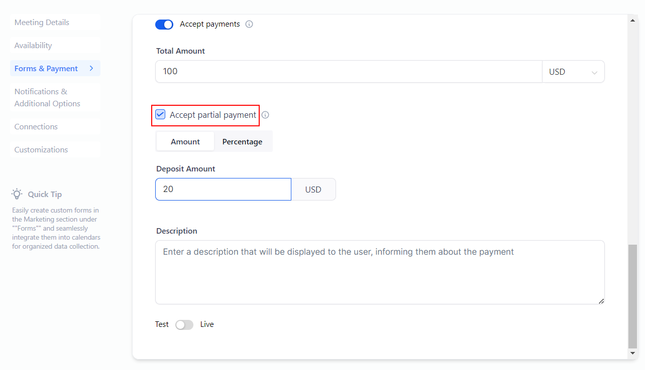You can also use the Accept Partial Payment option to collect deposit fees for the appointment. The amount you collect is up to you and can be set as either a fixed amount or a percentage of the total.