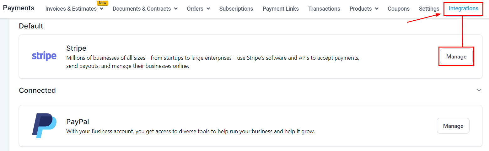 To start make sure you have a payment gateway connected. If you hadn't before go to the Payments and select the Integrations tab at the top. If it is already connected it will say Manage, otherwise please connect it before continuing.