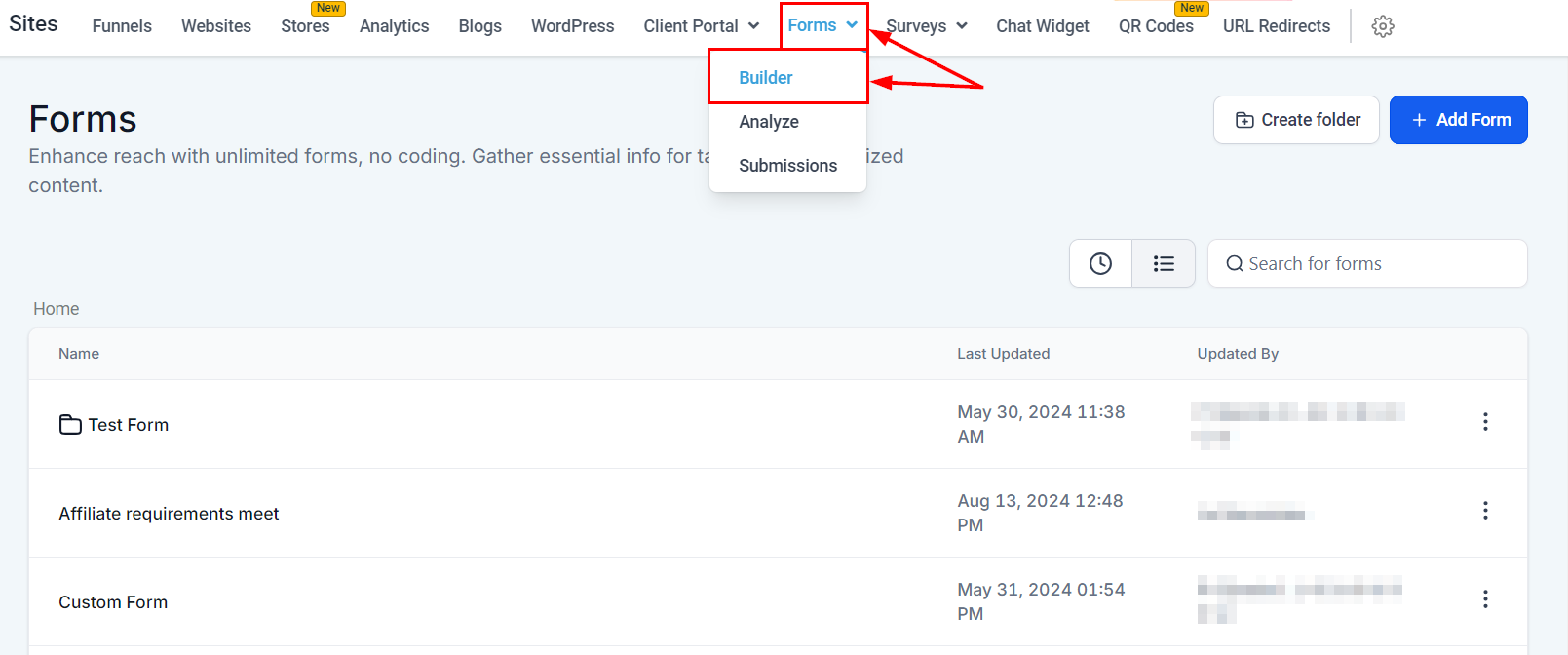 Navigate to the 'Sites' section. Select 'Forms' and then choose 'Builder' to access the form creation area.