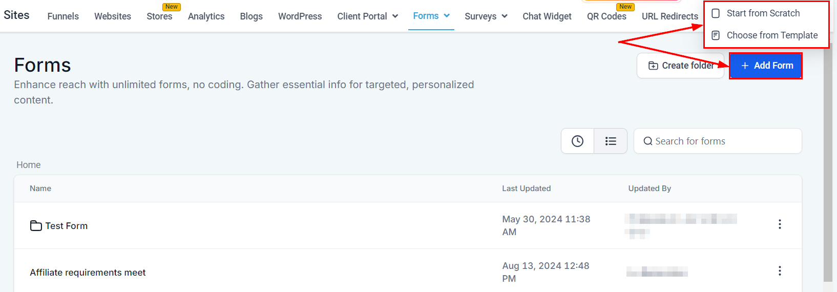 Click the "Add Form" button in the upper right-hand corner to start creating your form. You can either create the form from scratch or choose a template to begin.