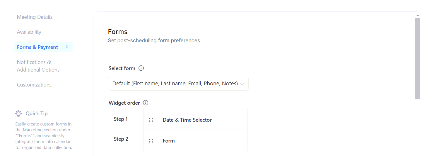 The platform provides a feature that enables users to create custom forms and link them to their calendars. This functionality is especially valuable for businesses that need to gather additional information from clients during the appointment scheduling process. Users can design a custom form with tailored questions and seamlessly connect it to the desired calendar.