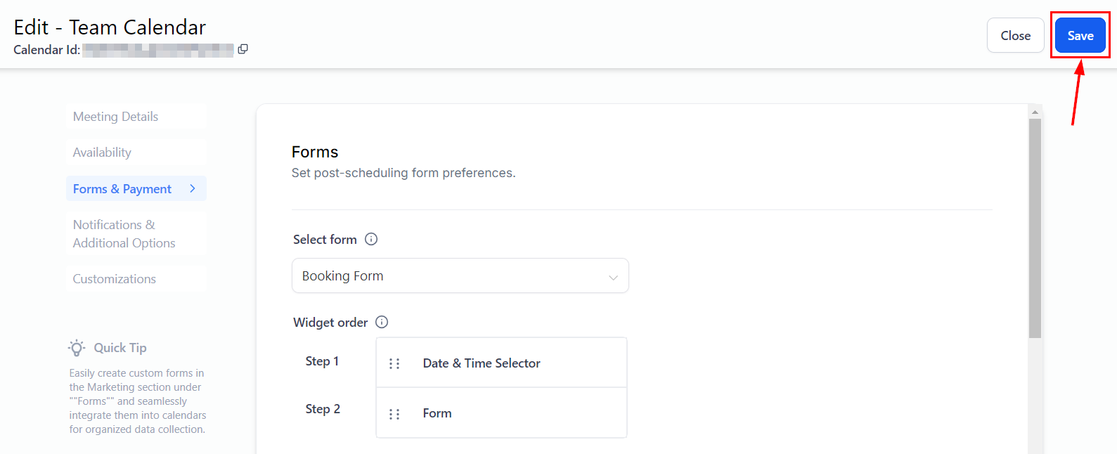 In the 'Forms & Payment' section, choose the form you just created from the dropdown menu.
