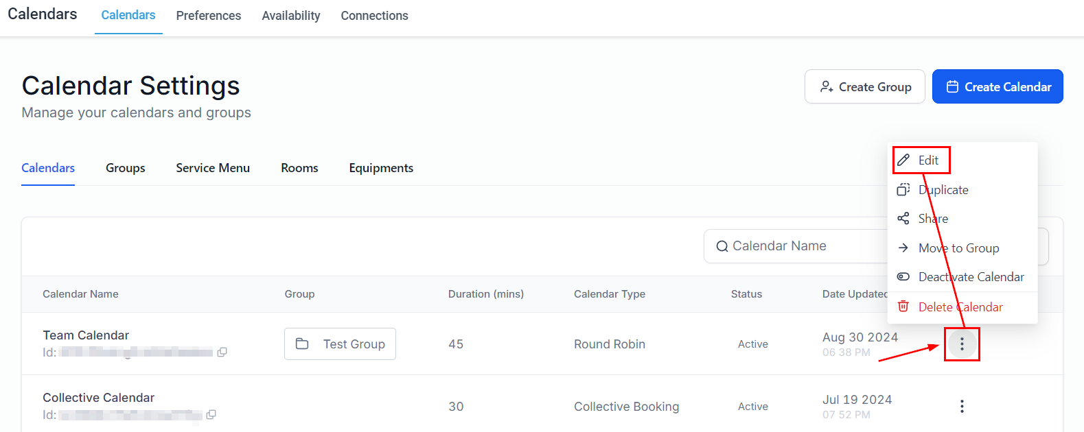 Click the three-dot icon next to the desired calendar and select the Edit option.