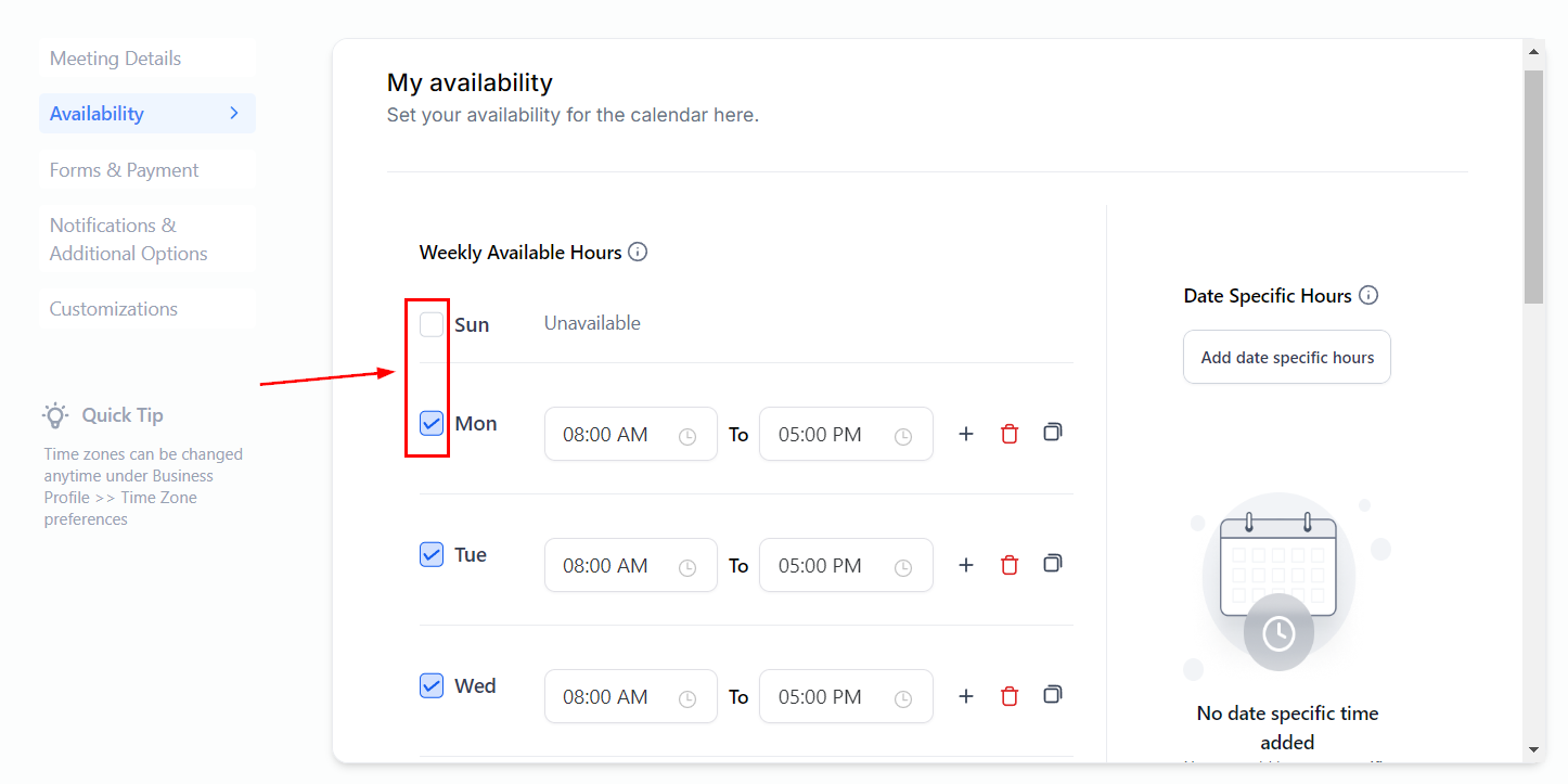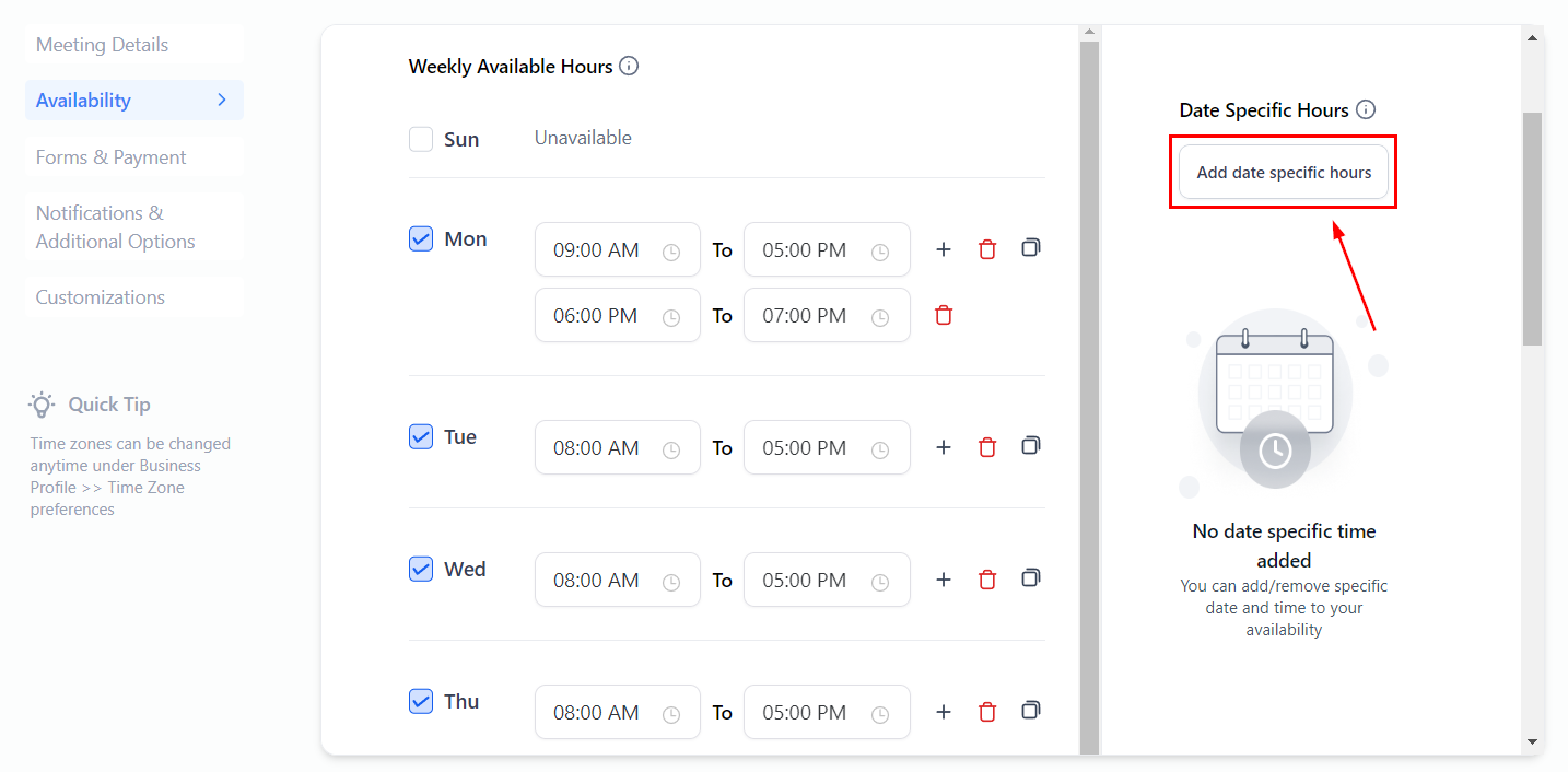 By setting Date Specific Hours you can override your regular weekly schedule for selected dates, to do so click Add Date Specific Hours.