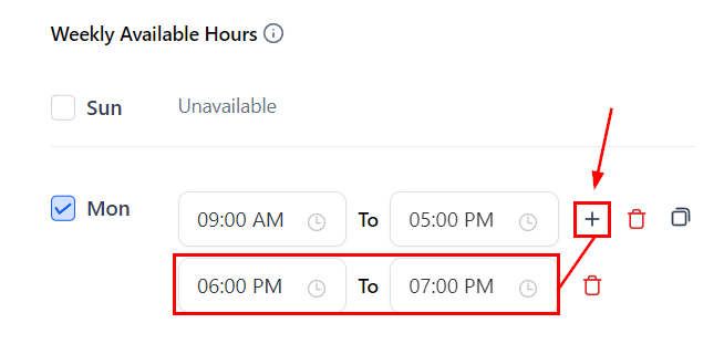 When you have a gap between the available time, click the + sign button to add the extra hours.