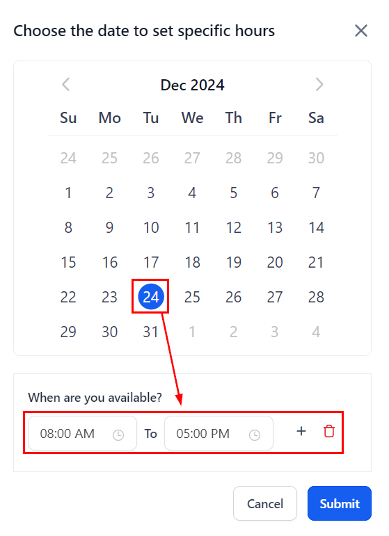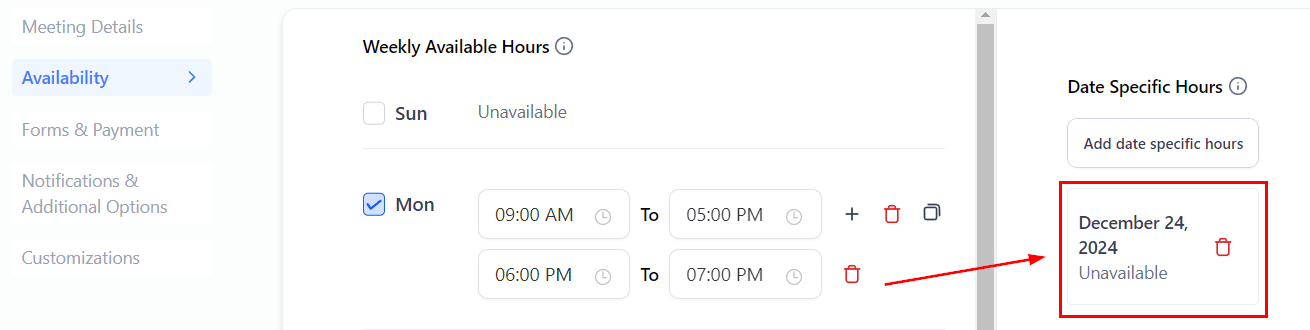 Click the date you need to customize then set your available hours or click the trash can icon to mark it as unavailable.