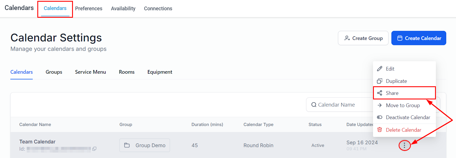 For a single calendar, select the three dots associated with the desired calendar and click Share.