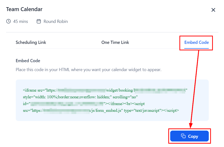 Within the popup modal, switch to the Embed Code tab, and click the βCopyβ button to save the code to your clipboard.