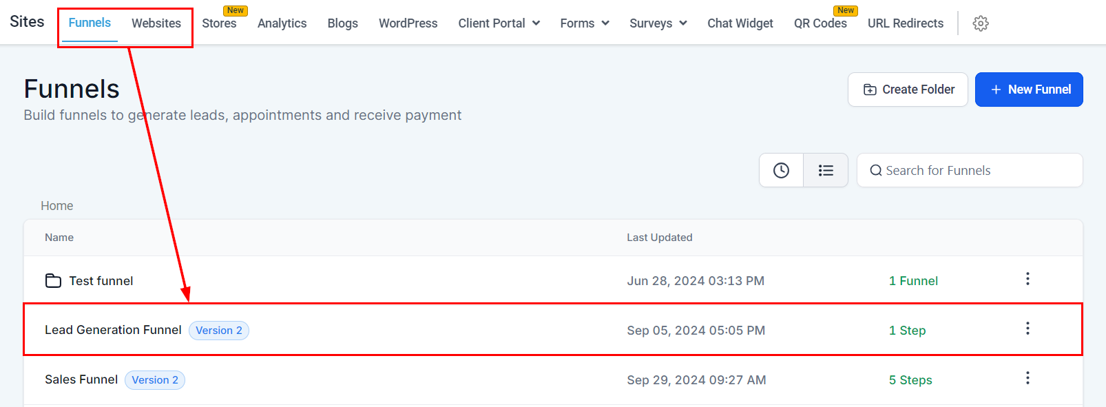 Select the desired funnel step or website page, then click Edit to open the builder.