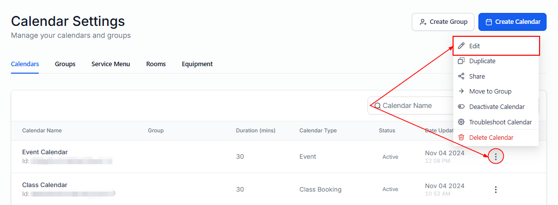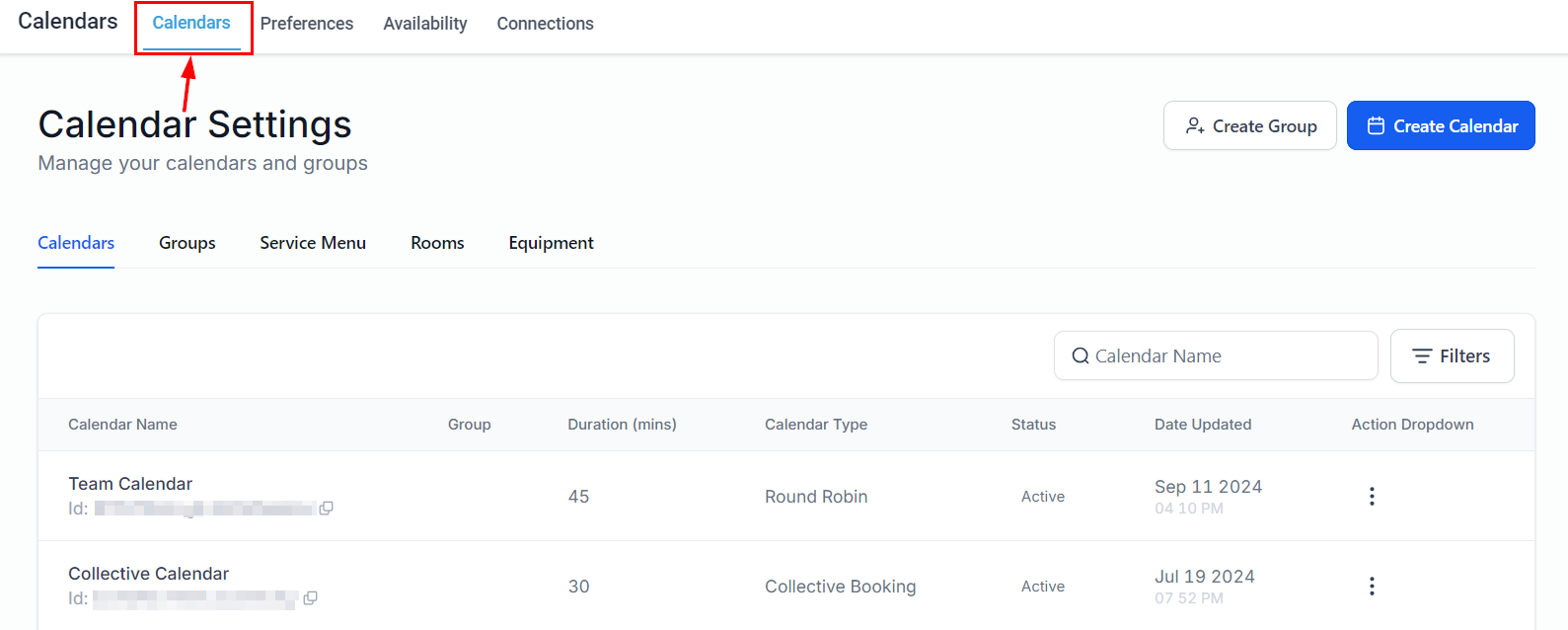 If you don’t already have a calendar set up, create one. Otherwise, proceed to edit a Round-Robin, Collective Booking, Event, or Class Booking calendar from your calendar list.