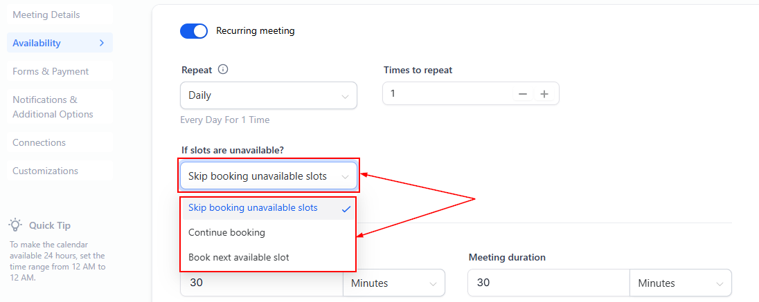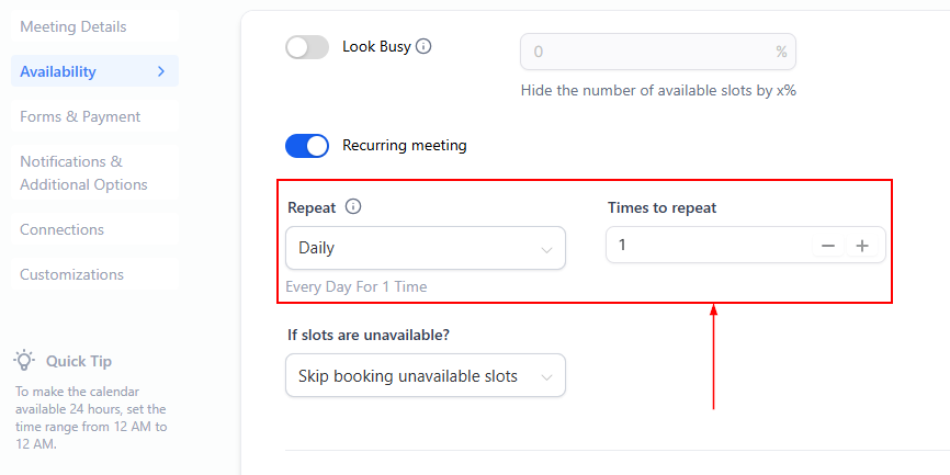 📌NOTE: This feature is unavailable for Service Calendars. To enable recurring meetings, ensure that only one team member is assigned to the calendar, and no date-specific hours are set.