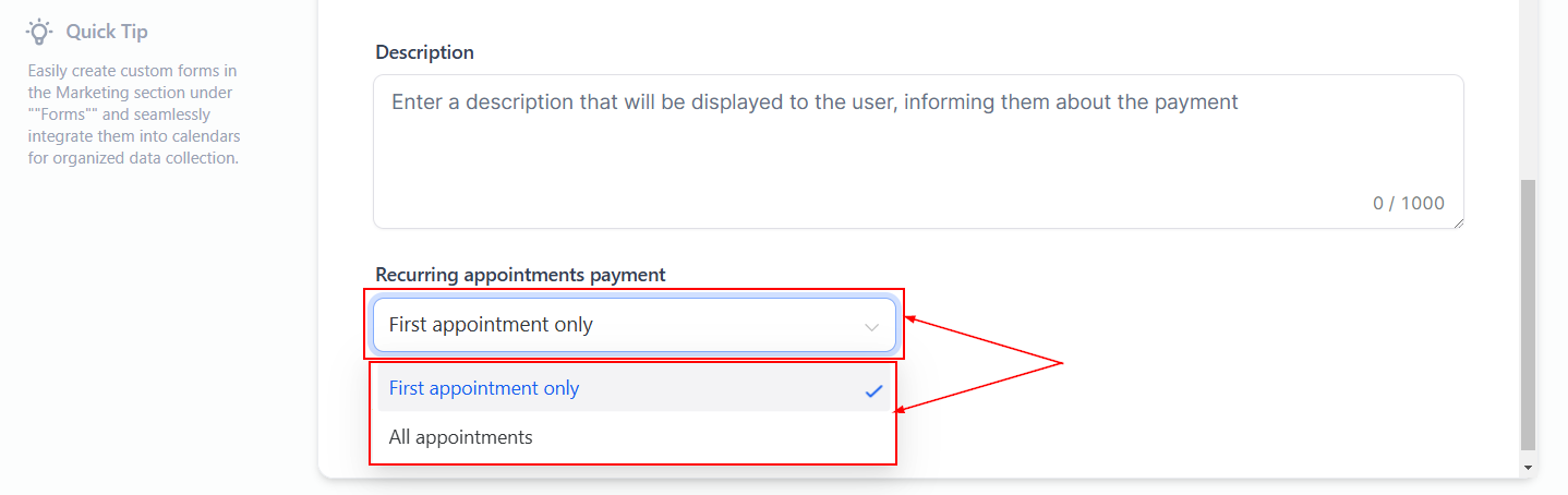 You can choose between two payment options: clients can pay either for the “first appointment only” or for “all appointments” in the series.