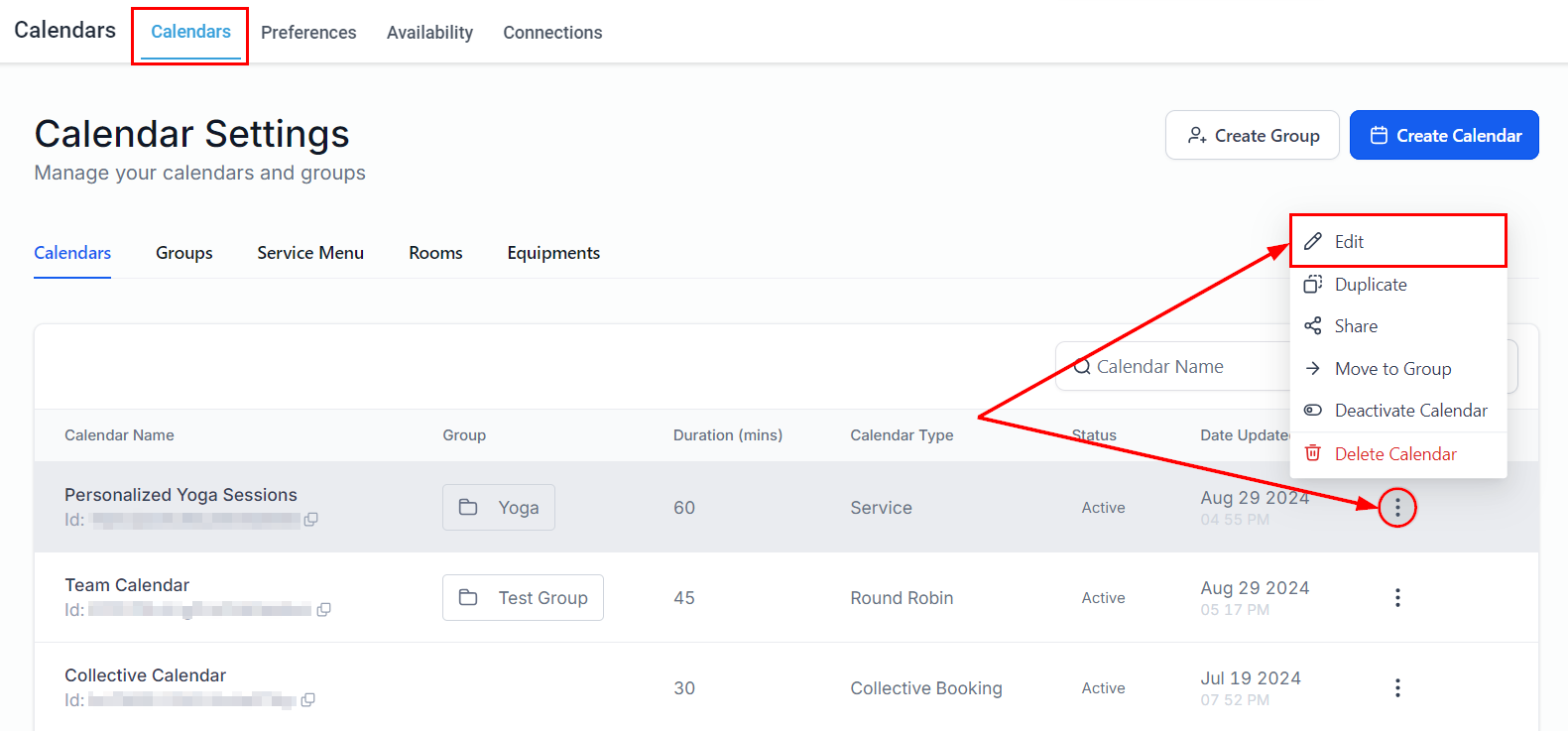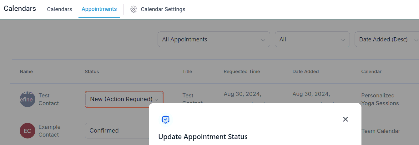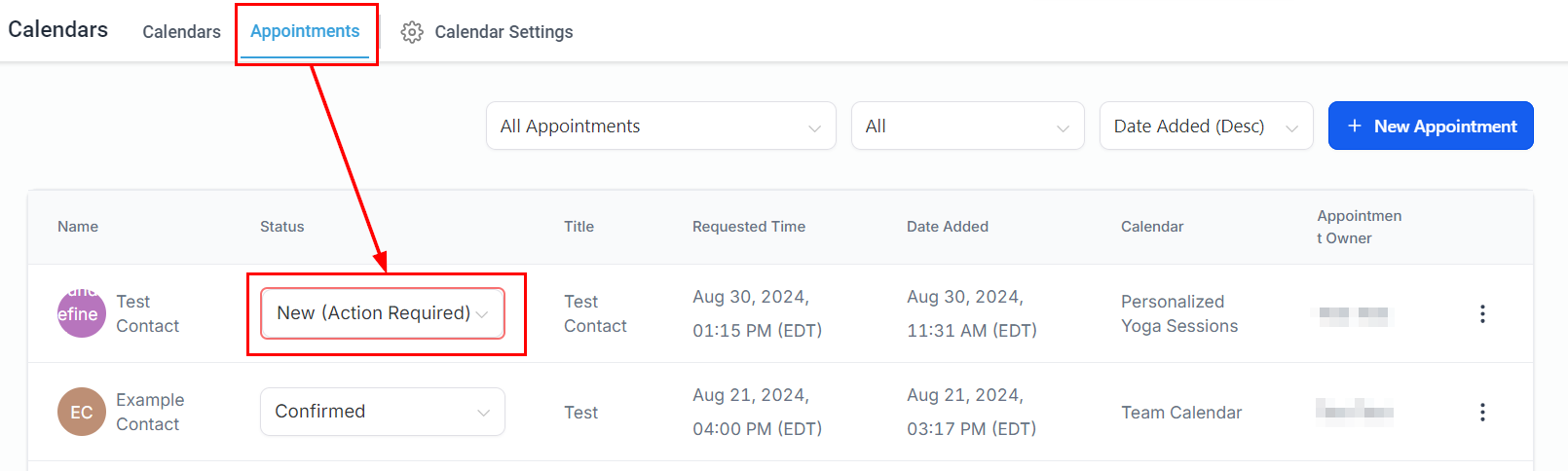 Navigate to the appointments tab within the Calendars section. Appointments pending review will be marked as βaction required" in the Status column.