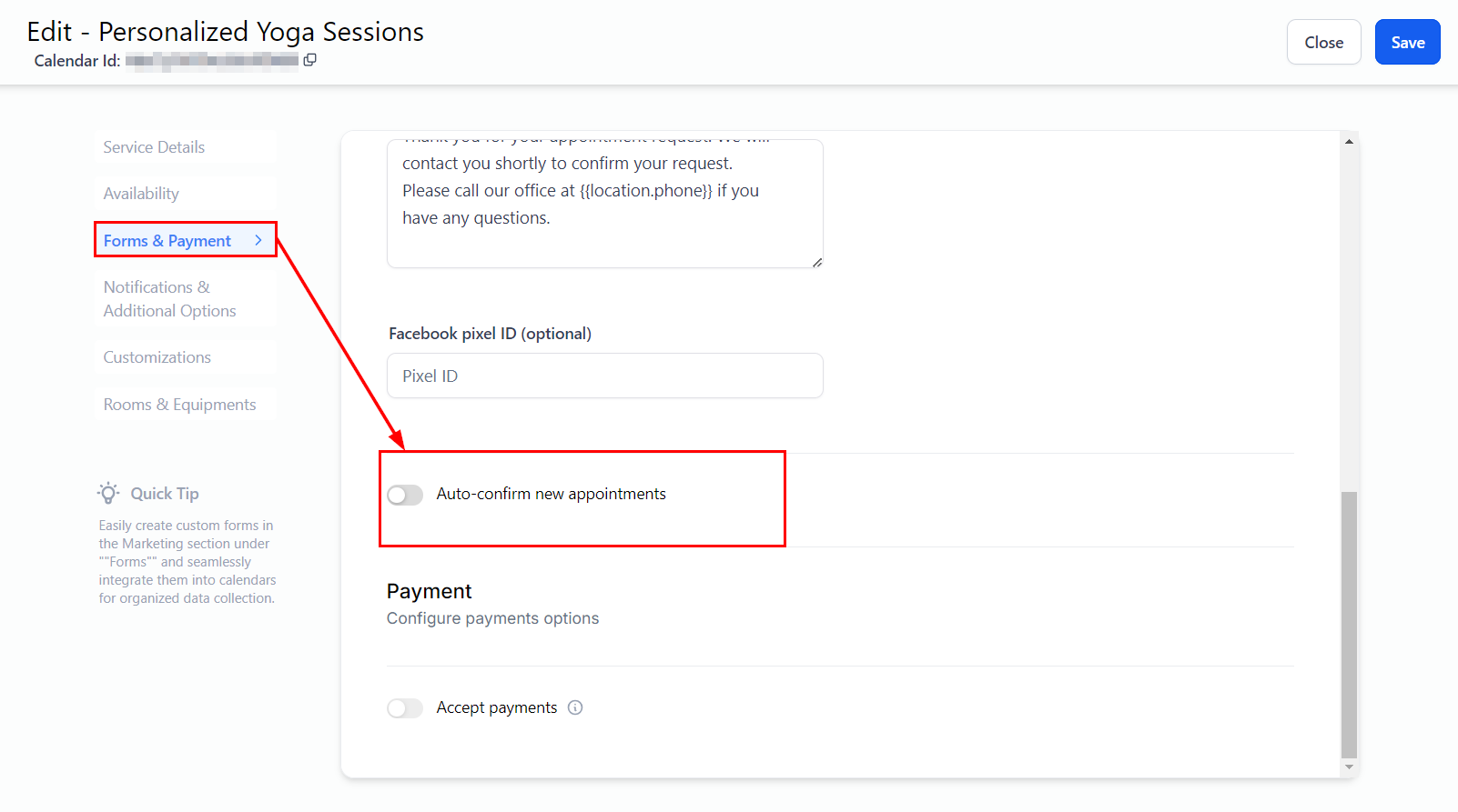 From the Forms & Payment section, locate the Auto-confirm new appointments switch. Ensure it is toggled off as shown below.