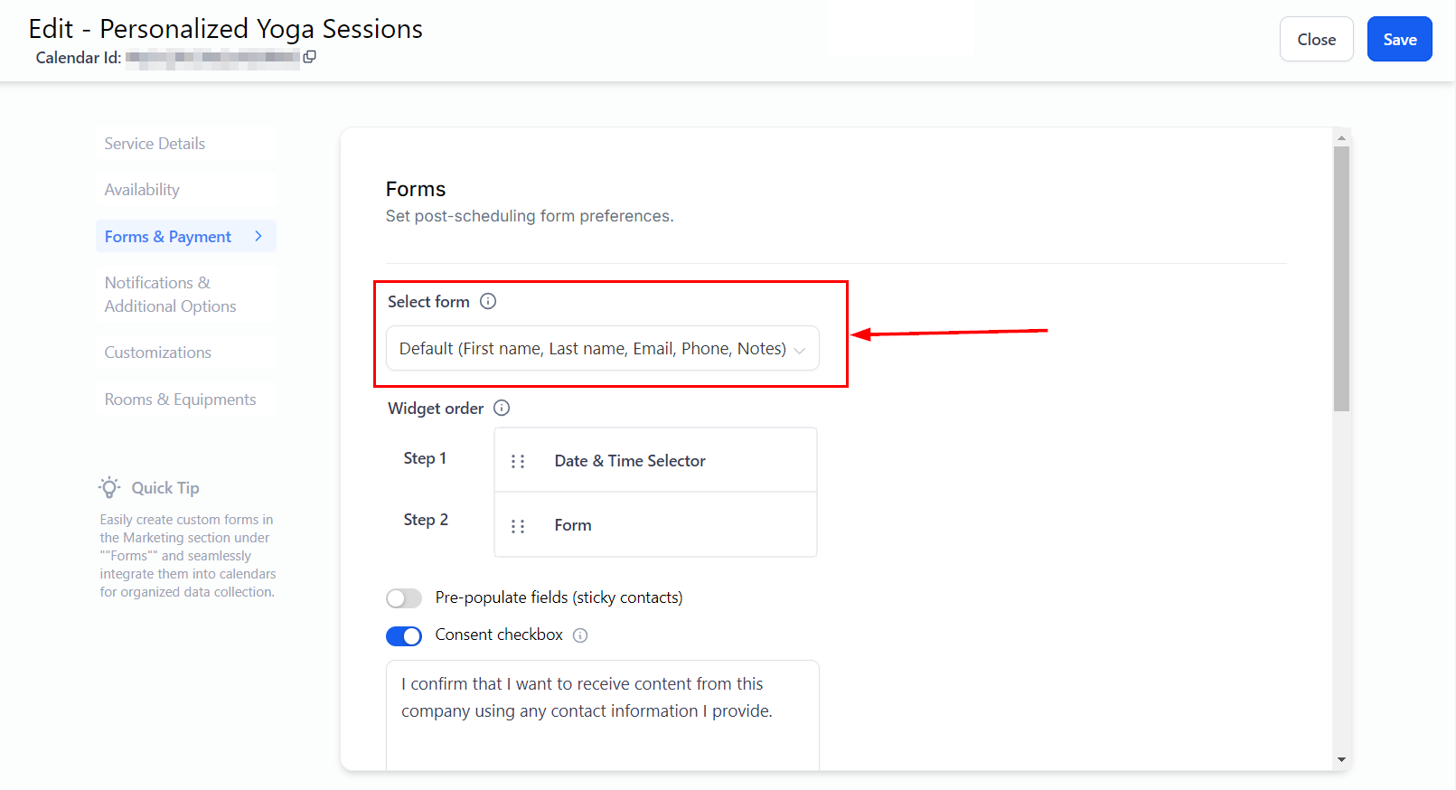 Ensure you're in the Forms & Payment step of the calendar setup process.
