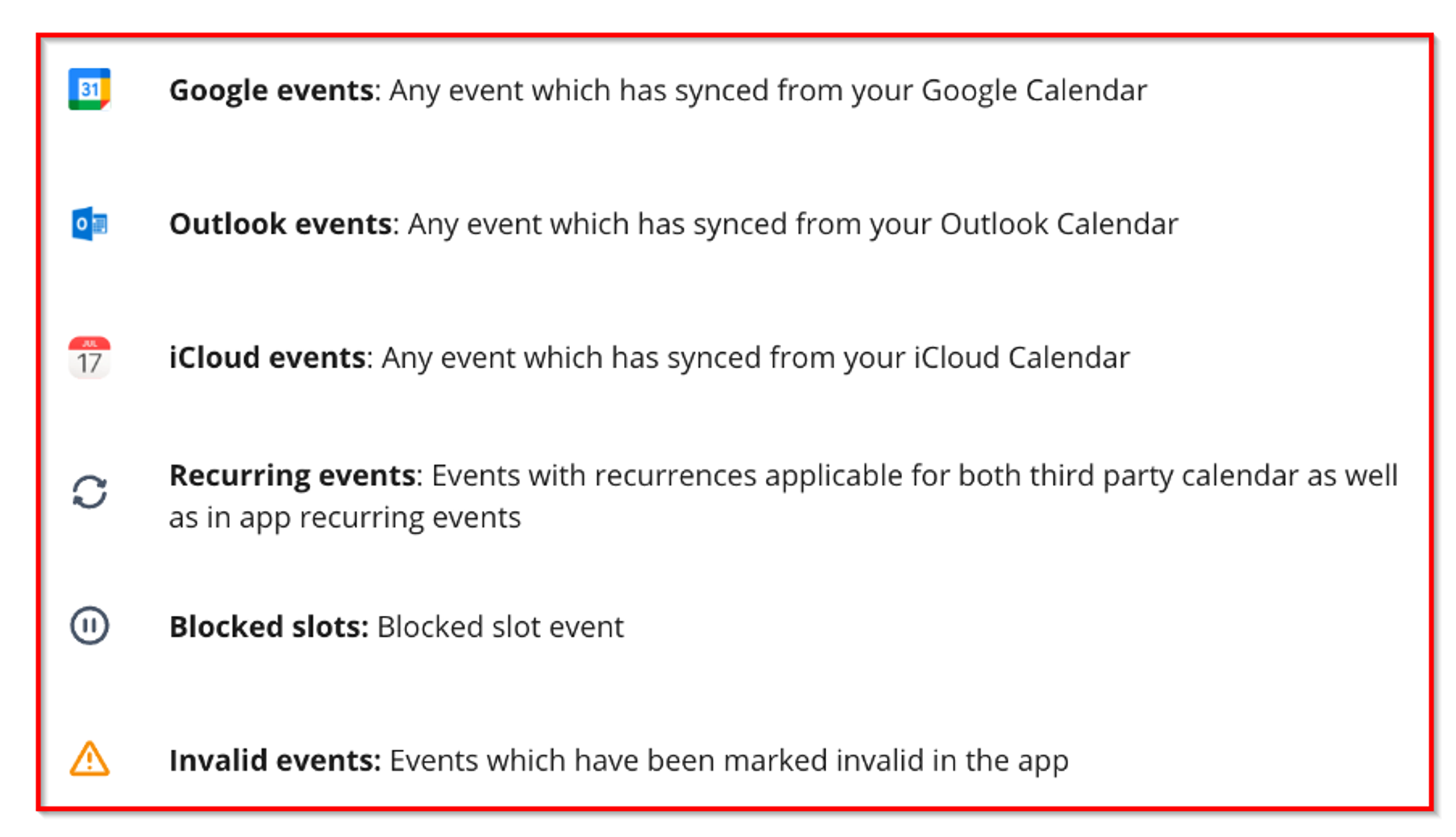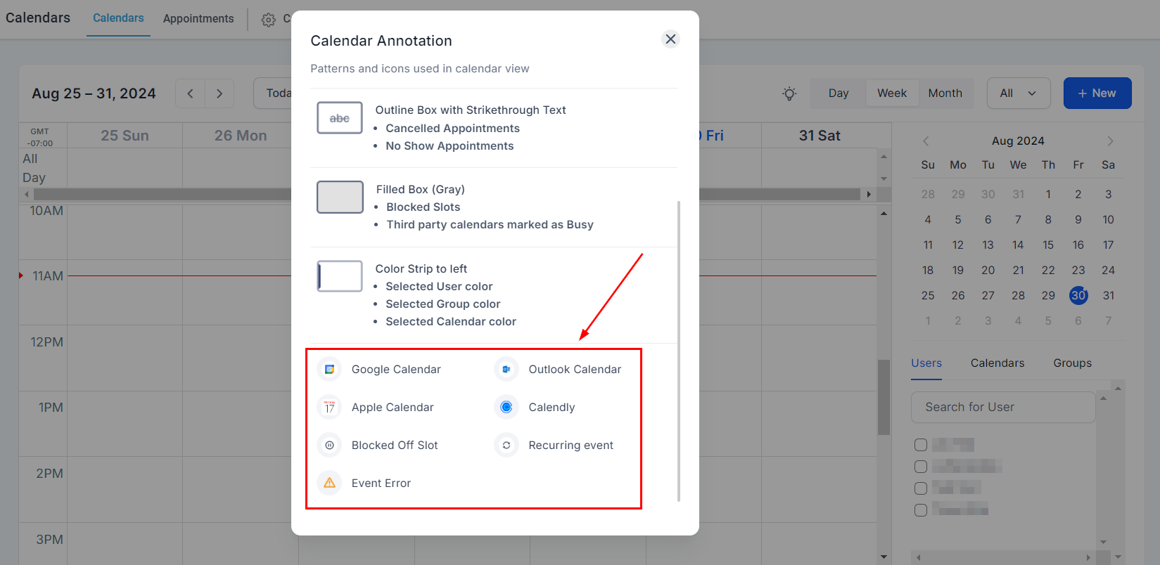 You will find all the different calendar patterns and icons that your CRM calendar uses. These are meant to give you a quick and easy analysis of your calendar so you do not need to click into each event and look for specific data.