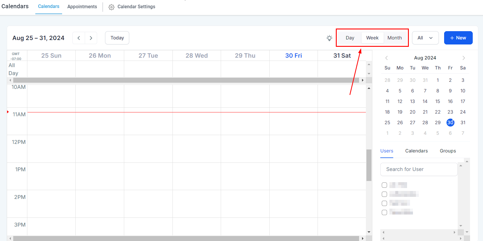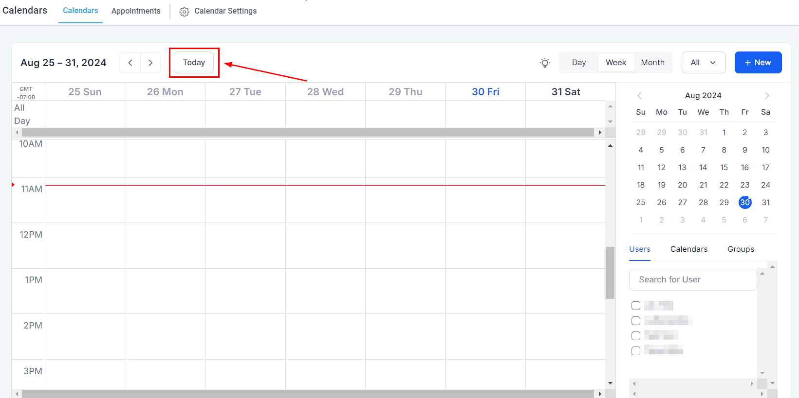 To quickly switch back to a daily view of what your daily schedule looks like, simply click on the Today button on the top left of the page. When you click on the button, you will see the present day highlighted to quickly view your current schedule.