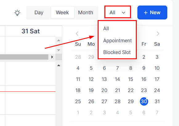 You can filter your calendar view to show all, appointments, or blocked slots. The calendar is automatically set to show all events on the calendar. To change this view, click on the blue button labeled All, and select which you want to view.