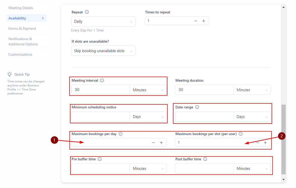 Meeting Interval: This will be the frequency for available time slots. For example, if you have a 30-minute slot interval, then your time slots will show availability every 30 minutes (10:00 am, 10:30 am, 11:00 am, etc.)