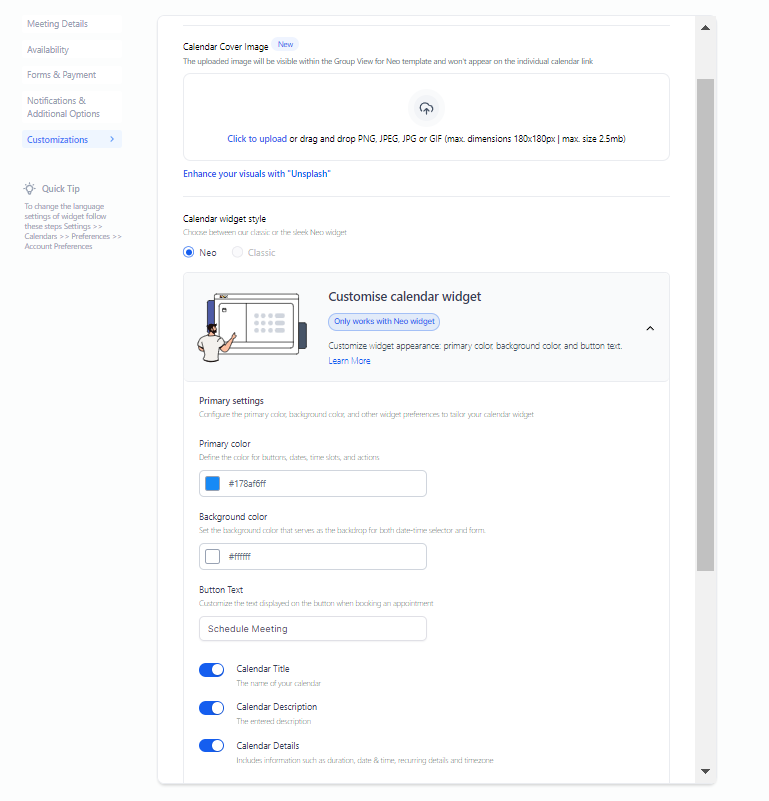 Personalize your calendar to the max here, you can add a cover image, change the style and colors of the calendar, the text of the button, and the information shown on the calendar.