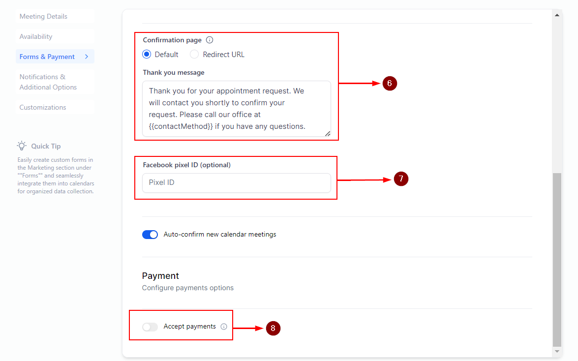Confirmation Page: This will show after someone makes a booking, if you use Default you can set a custom message on the same page, or by selecting Redirect URL you can send the contact to a website of your choice.