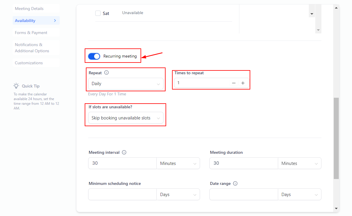 Toggle this option for meetings that happen more than once. Set the frequency at which this appointment should happen, Times to repeat will be the total amount of this appointment that will be scheduled consecutively. For unavailable slots, you can skip booking unavailable slots, book the appointment in the next available slot, or continue booking.