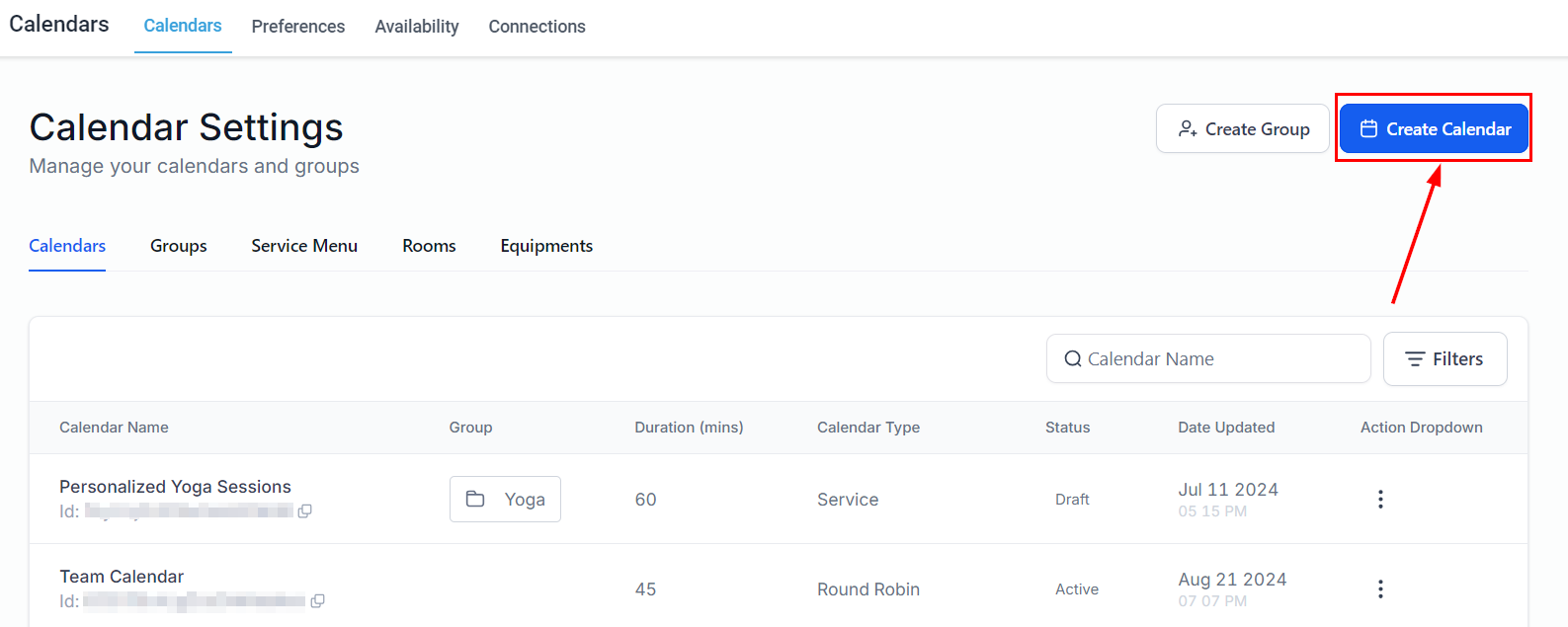 Select the Create Calendar button located in the upper right-hand corner.