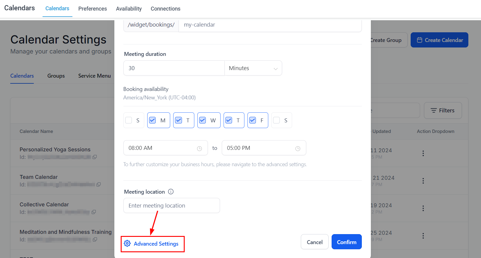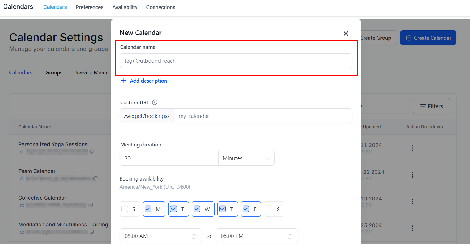 After choosing the Calendar group, you'll be directed to fill out key components of the Calendar configuration such as its name, meeting duration, and booking availability.