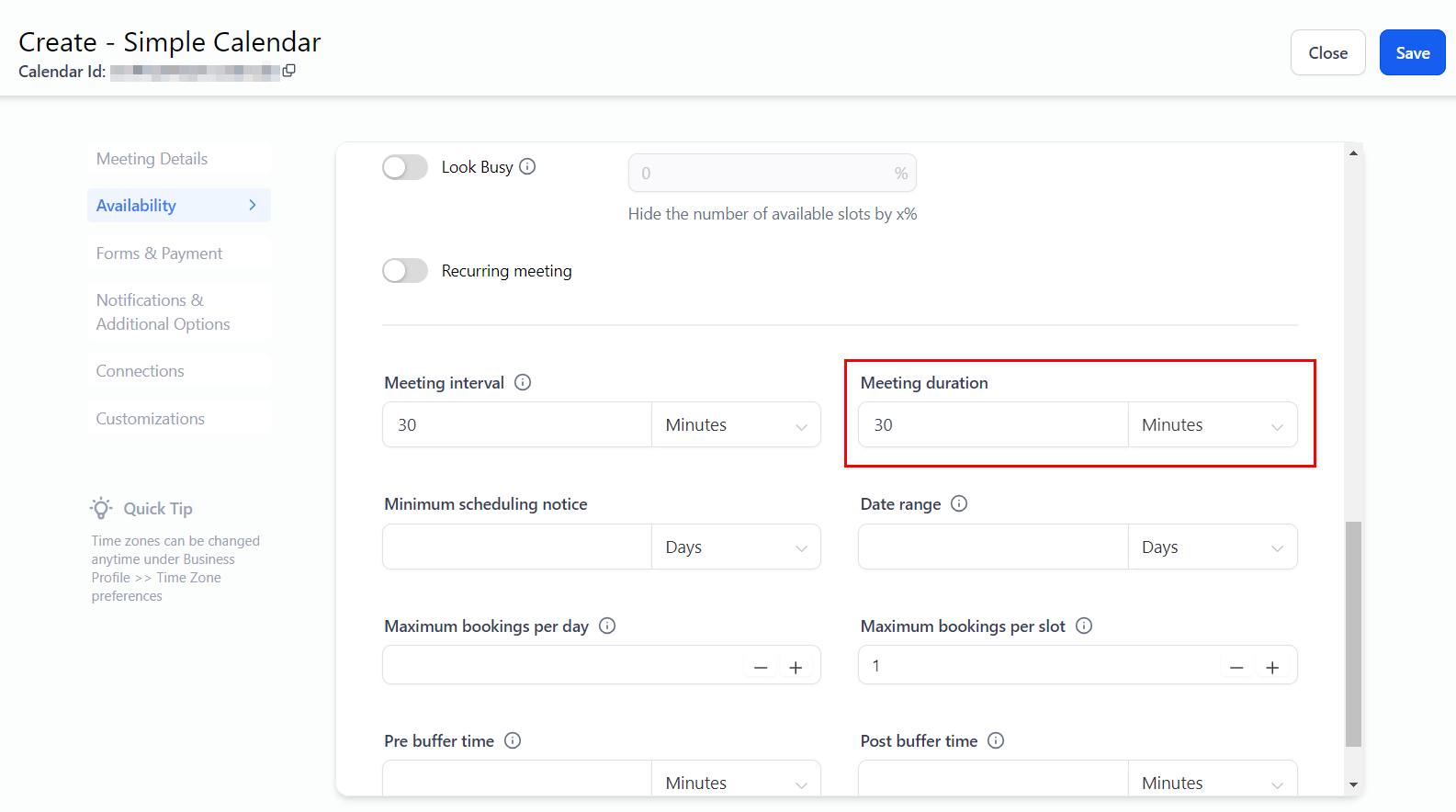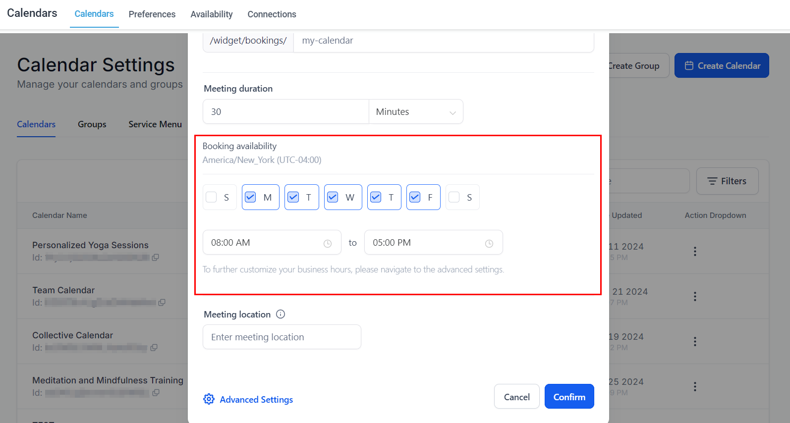 The meeting duration feature allows you to define the length of each appointment or meeting. This setting determines how much time will be allocated for each session.